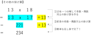 例えば13x18ですが、これは13x17に13を足すだけです!13x17は偶数x奇数の掛け算なので③を利用すれば解けるはずです。